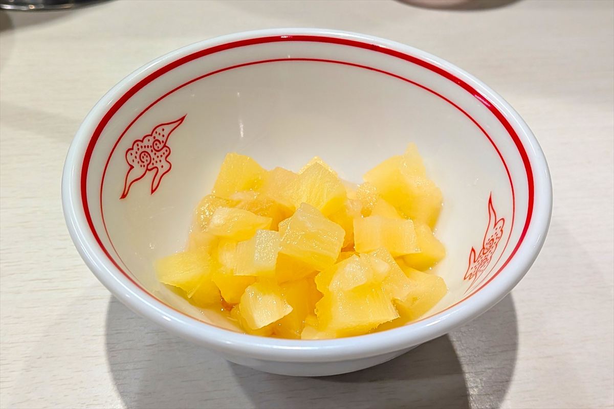 酸っパイナップル 120円 2025年小さなキューブ状のパイナップルです。酢漬けされているそうです。辛さが尖っているメニューの方が合うのかもしれません。写真3枚めは半北極ラーメンにトッピングした物です。2026年1月15日から1ヶ月だけ東池袋限定の発売。 戻る