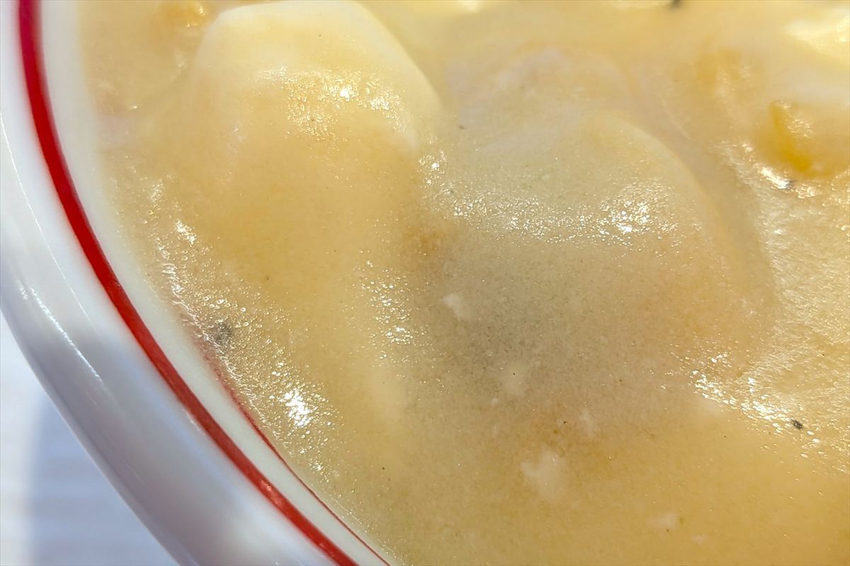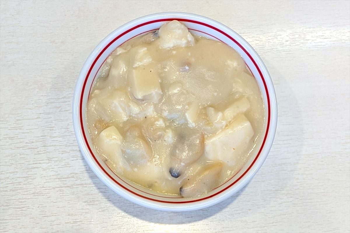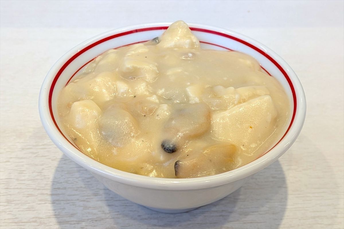 | 2025年12月22日~30日まで船橋にて登場。2種類のチーズとふんだんのアサリ、ホタテの旨味、豆腐を使用したクラムチャウダー風麻婆。辛さはありません。それは麻婆なのか?とも感じますが、中本が麻婆と言ったら麻婆なのです。食券は券売機「大盛変更」のカテゴリにあり、価格は蒙古麻婆を使用しているメニューの麻婆をクラムチャウダー麻婆に変更する値段です。定番では定食、単品麻婆、蒙古タンメン、冷し五目蒙古タンメン等。使用されている蒙古麻婆の量に関係なく価格は同じです。「クラムチャウダー麻婆丼弁当」や「クラムチャウダー麻婆丼単品弁当」でも可です。 | ||||