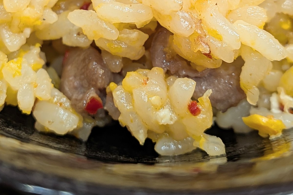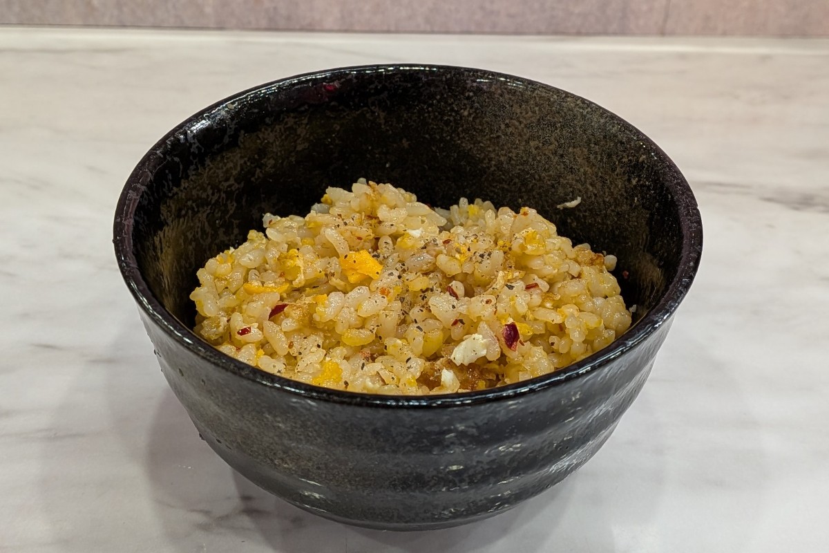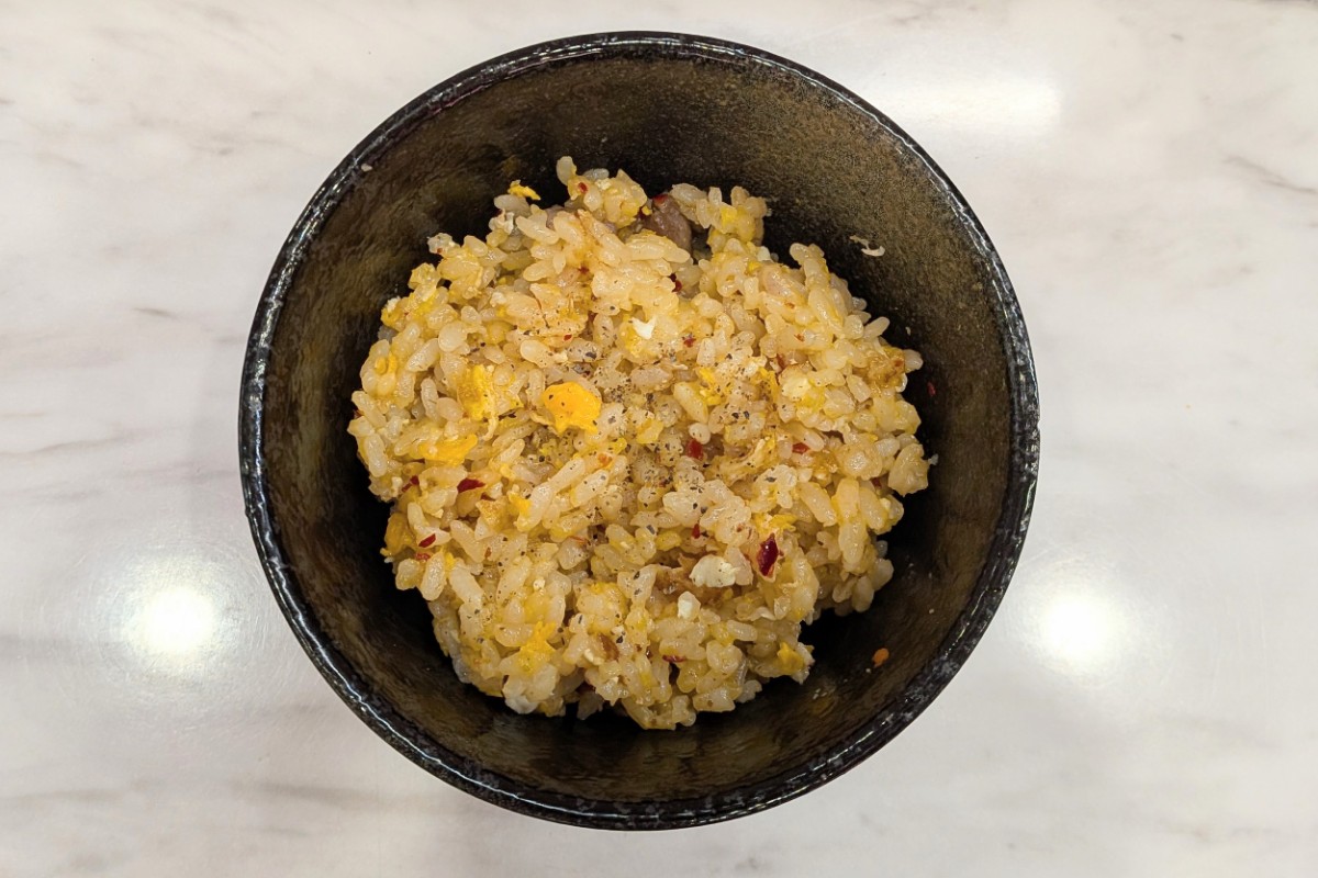 「市川飯A」から続く小さな器に入ったミニ丼でライスの量は130g。ライスを刻んだ鷹の爪をXO醬や味噌、醤油が入った特製ダレで炒め、茹で豚タンを加えたスパイシーなチャーハン風。市川の多様なトッピングを追加しても楽しめます。